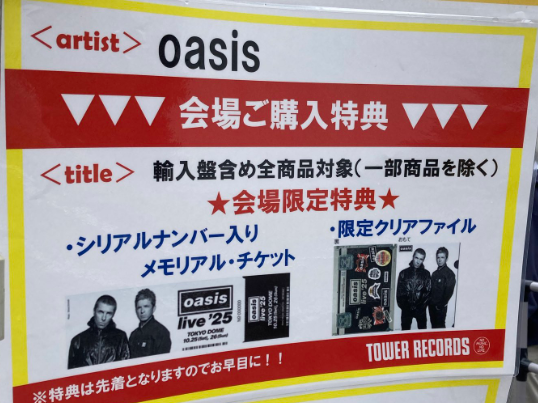 気持ちを切り替えてタワレコ渋谷のoasis特設コーナーで寄せ書きをする&初来日ライブ映像(NewGalleryで上映していた映像の短縮版)を観る&ミヤシタパーク再訪で気分を上げることに。タワレコoasisコーナーには日本の若者に加えてアジア圏の海外勢の若者までいたのが驚き。映像でトニーが映るたびに笑っていた男子、たしかに叩き方も独特だしカメラワーク変だけどそんなに笑ってやるなよと思いつつ渋谷を後にし、オープニングアクトのおとぼけビーバーに間に合うようドームシティに戻る。余裕があったので、ギャラガー兄弟と長嶋さんの「Our Giants Will Live Forever」看板が同時にカメラに収まる場所で記念撮影。高揚した気持ちで入場、開演までの曲をShazamで検索するなど。おとぼけビーバーの開演前は1990~2020年代ダンス系、oasis開演前は1960~70年ロックが流れる。THE WHOで一段とテンションUP。