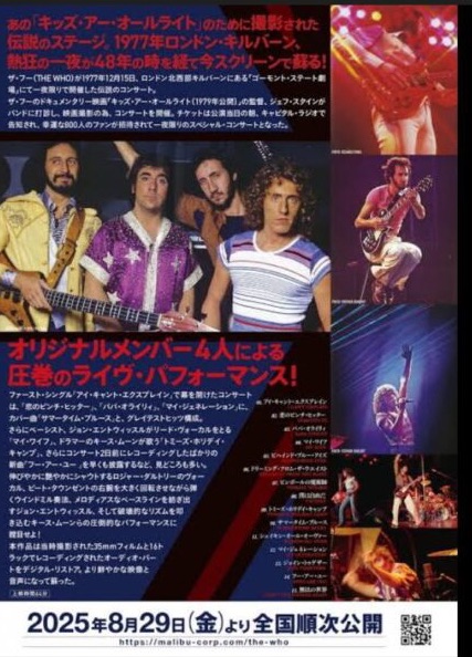 「The Who At Kilburn 1977(邦題:ザ・フー ライヴ・アット・キルバーン)」、「The Kids Are Alright(邦題:キッズ・アー・オールライト)」を観てきました!両作品とも過去に映像はリリースされてはいましたが、映像・音声をレストアされて日本の劇場では初公開となったそうです。「The Kids~」は公開初日トークショー付き上映の回をゲット!アメリカ大陸フェアウェルツアーも終盤、1971年のライブ盤もリリースされるし、2025年8~9月はまさにThe Who強化月間!という感じでした。